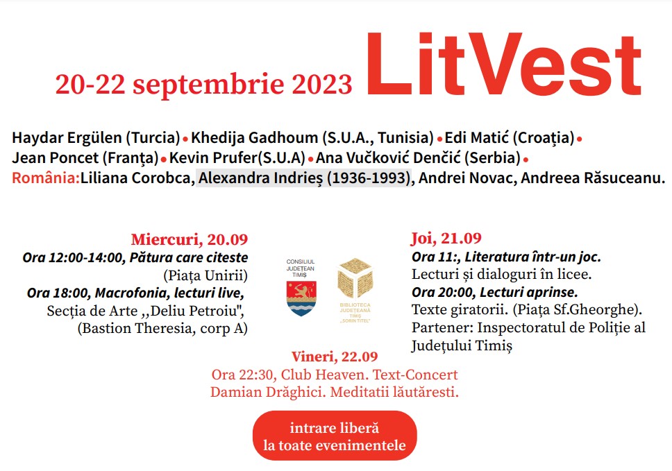 Cea de-a XIII-a ediție a festivalului de literatură LitVest, organizat de biblioteca județeană „Sorin Titel”, singurul festival de literatură românesc inclus din acest an în rețeaua europeană de festivaluri de acest gen, se va desfășura timp de trei zile, în mai multe locuri publice din oraș.